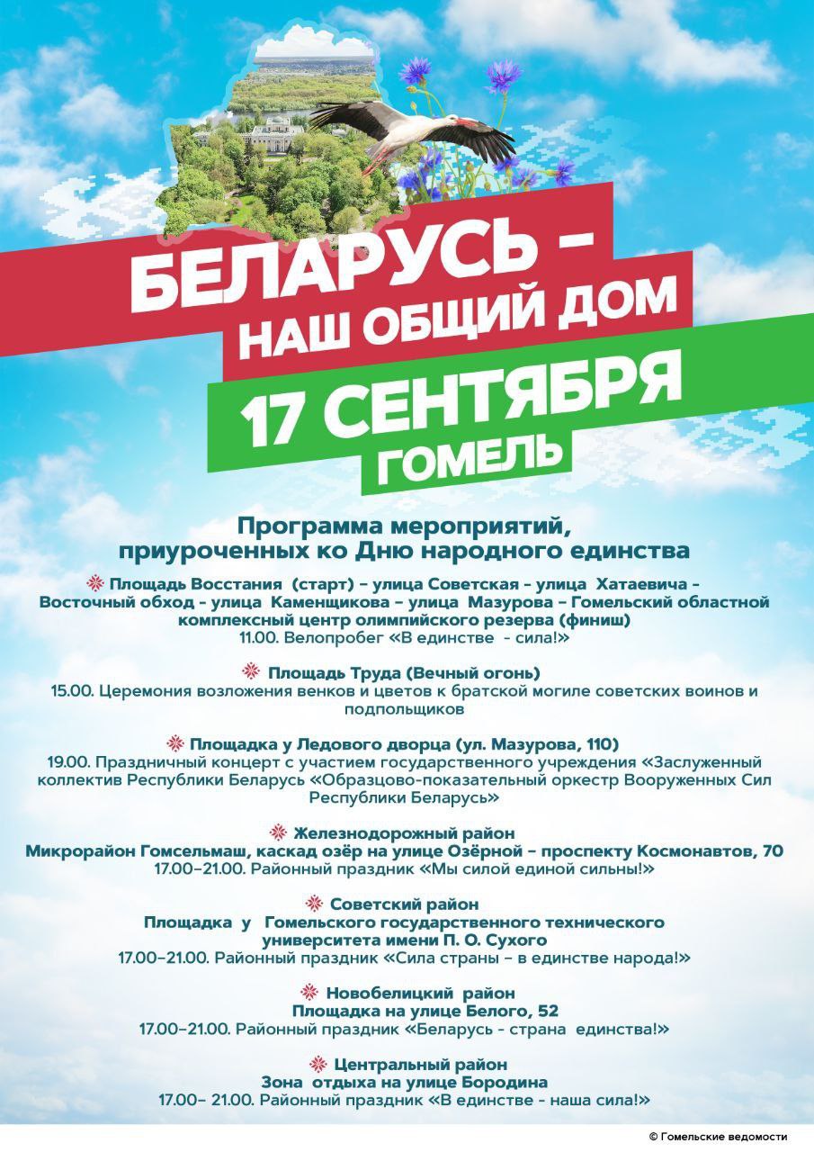 17 сентября Гомель станет центром масштабных мероприятий, посвящённых Дню народного единства: от митингов и концертов до молодёжных акций и городских инициатив.