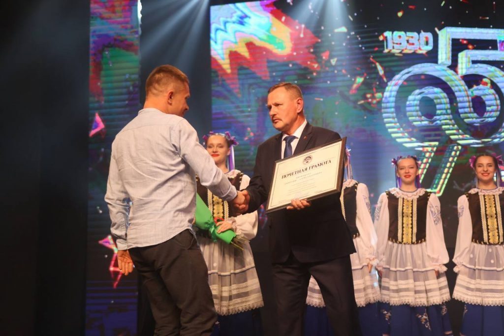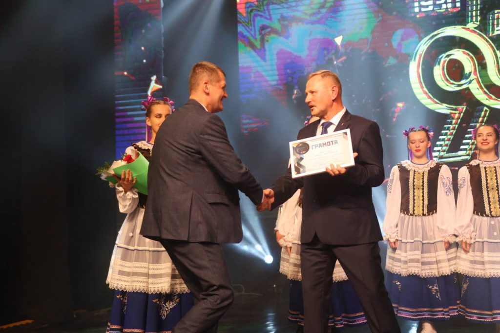 Награды со сцены вручил председатель Гомельской областной организации Белорусского профсоюза работников отраслей промышленности «БЕЛПРОФМАШ» Иван Швед.