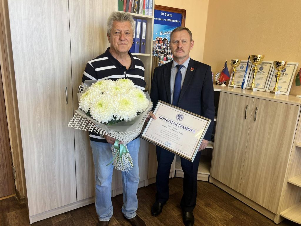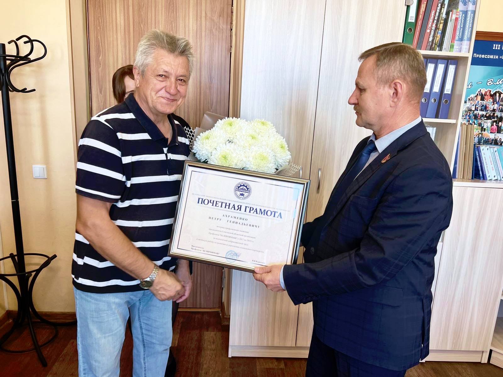 За многолетний добросовестный труд, личный вклад в развитие профсоюзного движения Гомельской области Петр Геннадьевич Ахраменко награжден Почетной грамотой Белорусского профсоюза работников отраслей промышленности «БЕЛПРОФМАШ». Награду он получил из рук председателя областной организации отраслевого профсоюза Ивана Шведа.